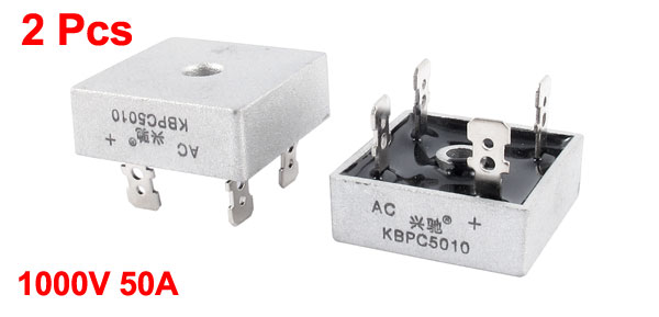 Product Name Single Phase Bridge Rectifier Model No. KBPC5010 Output Current(DC) 50A Repetitive Peak Reverse Voltage(AC) 1000V Fixing Hole Diameter 6mm / 0.24" Overall Size(Approx.) 31 x 31 x 22mm / 1.2" x 1.2" x 0.9"(L*W*H) Material Aluminum, Plastic Net Weight 47g Package Content 2 x Single Phase Bridge Rectifier - Reviews