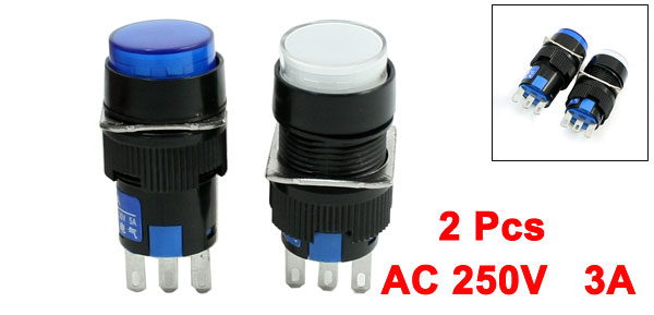 Item Name Push Button Switch Contact Type SPDT, 1NO, 1NC Switch Type Latching Type Switch Working Voltage AC 250V, 3A Switch Color White, Blue Pin Number 3 Button Cap Diameter 15mm/ 0.59" Mounting Thread Dia. 16mm/ 0.63" Total Size 18 x 18 x 38mm/ 0.71" x 0.71" x 1.6"(L*W*H) Material Plastic, Electronic Parts Weight 10g Package Content 2 x Push Button Switch - Reviews