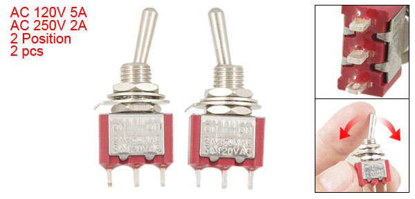 Product Name Toggle Switch Rating AC 120V 5A; AC 250V 2A Pin Number 3 Pins Position 2 Type SPDT Screw Diameter 6mm Total Size(Approx.) 3.3 x 1.3 x 0.7cm / 1.3" x 0.5" x 0.3"(L*W*T) Material Plastic & Metal Color Red & Silver Tone Weight 10g Package Content 2 Pcs x Toggle Switch - Reviews