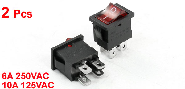 Product Name Rocker Switch Poles DPST Terminals 4 Pin (ON-OFF) Rating Voltage 6A 250VAC, 10A 125VAC Light Color Red Total Size 2 x 1.5 x 2.8cm/0.78" x 0.59" x 1.1"(L* W *T) Mounting Dimension 2 x 1.2cm/0.78" x 0.47"(L*W) Color Black, Silver Tone Material Plastic & Metal Total Weight 10g Package Content 2 x Rocker Switch - Reviews