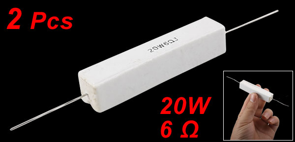Product Name Cement Resistor Body Material Ceramic, Cement Power 20W Resistance 6Ω Tolerance ±5% (J) Body Size (Approx.) 62 x 12 x 12mm/2.44" x 0.47" x 0.47" (L * W * H) Lead Diameter (Approx.) 0.7mm / 0.027" Color White Weight 40g Package Content 2 x Cement Resistor - Reviews