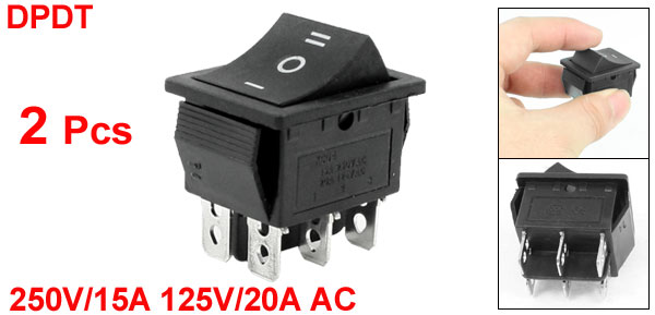 Product Name Rocker Switch Poles DPDT Terminals 6(On - Off-On) Rating Voltage 15A 250V AC, 20A 125V AC Total Size(Each One) 3.5 x 3.5 x 2.5cm / 1.4" x 1.4" x 1"(L * W * T) Mount Hole Size 2.8 x 2.2cm / 1.1" x 0.9"(L*W) Color Black, Silver Tone Material Plastic & Metal Total Weight 23g Package Content 2 x Rocker Switch - Reviews