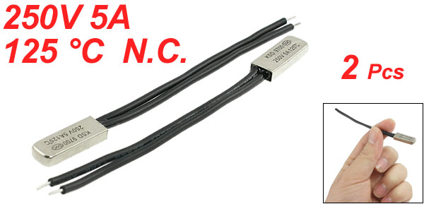 Product Name Temperature Control Switch Material Plastic, Bimetal Model KSD9700 Type N.C.9Normal Close) Contact Capacity 250V 5A Max Rated Disconnection Temperature 125C/257F Active Temperature 125± 5 °C Reset Temperature 90 ± 12 °C Color Black, Silver Tone Contact Cable Length 80mm/3.1" Head Size 20 x 7 x 3mm/0.8" x 0.3" x 0.1"(L*W*T) Weight 7g Package Content 2 x Temperature Control Switch - Reviews