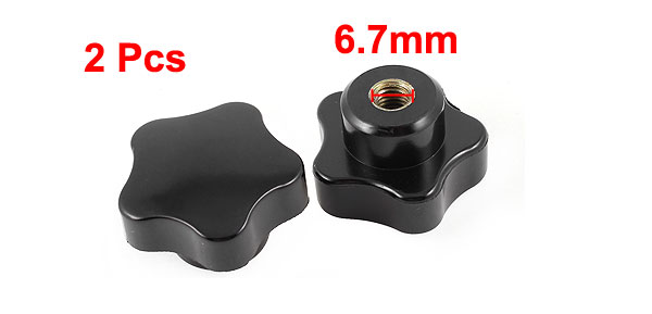 Details2 Pcs 25mm High 6.7mm Female Thread Diameter Black Star Knob  Product Name Star Knob Type Screw On Head Diameter 40m/1.6" Female Thread Diameter 6.7mm/ 0.26" Female Thread Depth 15mm/ 0.59" Total Height 25mm/ 0.98" Material Metal & Plastic Color Black Weight 57g Package Content 2 x Star Knob