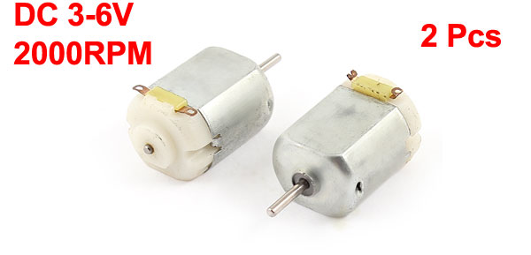 Product Name Micro DC Motor No Load Speed 2000RPM Voltage DC 3-6V Shaft Size 2mm/ 0.08" Body Size 30 x 20mm/ 1.2" x 0.8"(L*W) Main Color Silver Tone Material Metal Weight 34g Package 2 x Micro DC Motor - Reviews