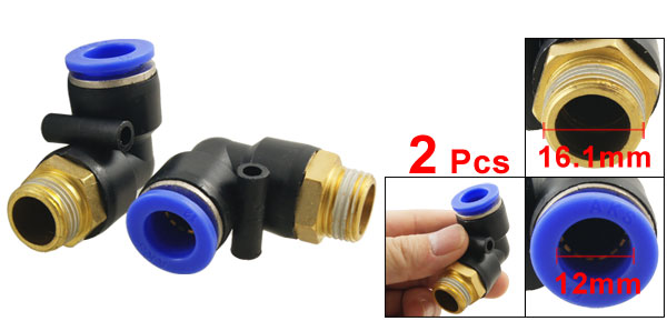 Product Name Pneumatic Fitting Inner Diameter(Blue End) 12mm / 0.472" Thread OD 16.1mm / 0.633" Thread Size 3/8" Total Size(Approx) 43x 40 x 20mm / 1.7" x 1.57" x 0.8"(L*W*H) External Material Plastic & Metal Color Black, Blue, Brass Tone Net Weight 60g Package Content 2 x Pneumatic Fitting - Reviews