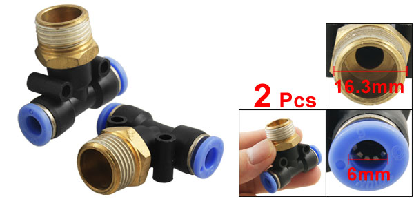 Product Name Pneumatic Quick Fittings Type T Connector One Touch Connector 6mm/ 0.236" Male Thread OD 16.3mm/ 0.64" Thread Size 3/8" Material Plastic, Metal Dimension (Approx) 3.8 x 3.5 x 1.3cm/ 1.5" x 1.37" x 0.51" (L*W*T) Color Black, Blue Weight 42g Package Content 2 x Pneumatic Quick Fittings - Reviews
