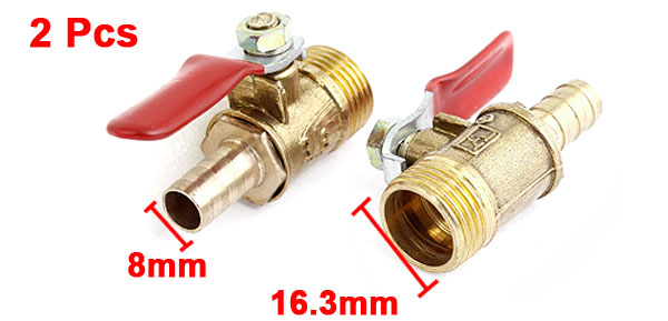 Product Name Ball Valve Type Male Thread to Hose Barb Male Thread Diameter 16.3 mm Male Thread Size 3/8" PT Hose Barb Outside Dia. 8 mm / 5/16" Level Handle Size 45 x 11mm / 1.8" x 0.43" (L*W) Body Size 41 x 17 mm / 1.6" x 0.67" (L*W)