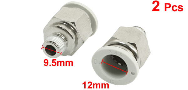 Details2 Pcs 3/8" Male Thread to 15/32" Tube One Touch Pneumatic Air Push In Fittings  Product Name Quick Fitting Total Size 32 x 19mm/ 1.3" x 0.75"(L*W) Thread Diameter 9.5mm/ 3/8" Inner Diameter (White End) 12mm/ 15/32" Hole Diameter 5.5mm/0.22" Main Material Metal, Plastic Color Gold Tone, White Weight 42g Package Content 2 Pcs x Quick Fittings