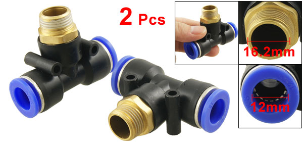 Product Name Pneumatic Quick Fittings Type T Connector One Touch Connector 12mm/ 0.47" Male Thread OD 16.2mm/ 0.637" Thread Size 3/8" Material Plastic, Metal Dimension (Approx) 5.8 x 4.6 x 2cm/ 2.28" x 1.81" x 0.8" (L*W*T) Color Black, Blue Weight 83g Package Content 2 x Pneumatic Quick Fittings - Reviews