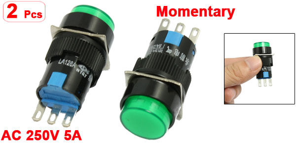 Details2 Pcs 3 Pin Momentary 1NO 1NC Green Round Push Button Switch AC 250V 5A  Item Name Push Button Switch Type Momentary, 1NO 1NC Thermal Current(Ith) AC 220V, 5A Switch Working Voltage AC 250V, 5A Button Color Green Button Diameter 15mm/ 0.59" Thread Diameter 16mm/ 0.63" Size 18 x 18 x 40mm/0.7" x0.7" x 1.6" (L*W*H) Material Plastic, Metal Weight 13g Package Content 2 x Push Button Switch