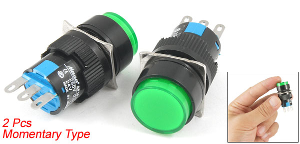 Details2 Pcs 3 Pin Panel Mount Momentary Push Button Switch Wkwpu  Item Name Panel Mounting Push Button Switch Type Momentary Voltage AC 250V 0.5A DC 24V 1A Button Color Green Button Diameter 1.6cm/ 0.6" Size 2.2 x 4.2cm / 0.8" x 1.6" (D*L) Material Plastic, Metal Net Weight 12g Package Content 2 x Panel Mount Push Button Switch