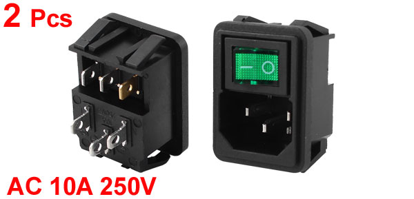 2 Pcs 3 Pin SPST Green Light Rocker Switch IEC320 C14 Power Socket AC 10A 250V