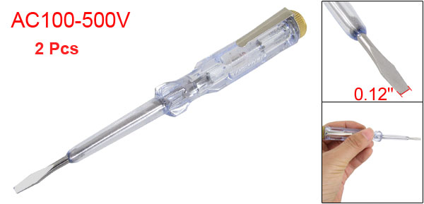 Details2 Pcs 3mm Slotted AC100-500V Screwdriver Electroprobe  Product Name Electroprobe Voltage AC100-500V Casing Material Plastic Slotted Bit Width 3mm/0.12" Size(Approx.) 14 x 1.5cm/5.5" x 0.6"(L*Dia.) Color Clear Blue, Silver Tone Weight 34g Package Included 2 x Electroprobe