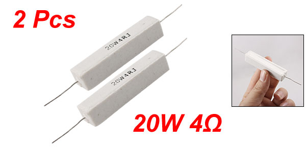 Product Name Cement Resistor Body Material Ceramic, Cement Power 20W Resistance 4Ω Tolerance ±5% (J) Body Size (Approx.) 61 x 12 x 13mm/2.4" x 0.47" x 0.51" (L * W * H) Lead Diameter (Approx.) 0.7mm / 0.027" Color White Weight 40g Package Content 2 x Cement Resistor - Reviews