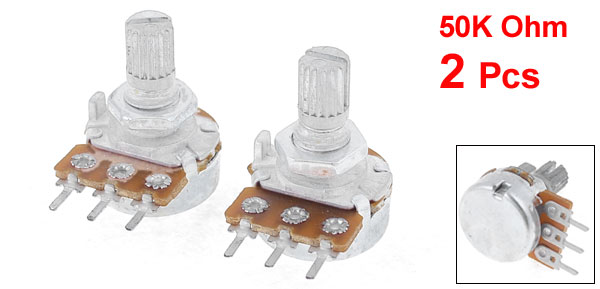 Details2 Pcs 50K Ohm B50K 3 Terminals Single Linear Taper Rotary Potentiometer  Product Name Potentiometer Type Rotary Shaft Potentiometer Resistance Value 50kΩ Threaded Part Diameter 6mm/ 0.24" Shaft Size 5 x 8mm/ 0.2" x 0.3" (D*L) Size 16 x 25 x 23mm/ 0.6" x 0.98" x 0.9" (D*W*H) Color Silver Tone Weight 13g Package Content 2 x Potentiometer