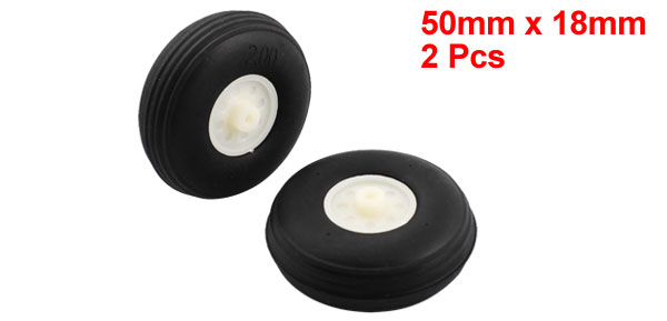 Product Name RC Airplane PU Wheel Wheel Size 50 x 18mm/2" x 0.71"(D*T) for Shaft Dia 3mm/0.12" Material Rubber, Plastic Color Black, White Net Weight 14g Package Content 2Pcs x RC Airplane PU Wheel
