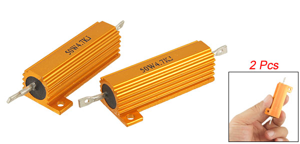 Product Name Aluminum Resistor Resistance Value 4.7K Ohm Resistance Tolerance ± 5% (J) Power Rating 50W Dimension 7.3 x 2.7 x 1.5cm/ 2.8" x 1" x 0.6" (D*W*H) Mount Size 4.2 x 2cm/ 1.6" x 0.8" (L*W) External Material Aluminum Color Gold Tone Net Weight 50g Package Content 2 x Aluminum Resistors - Reviews