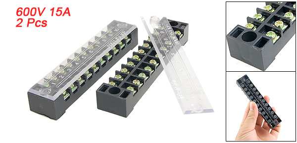 2 Pcs 600V 15A Dual Row 10P Covered Screw Barrier Terminal Blocks