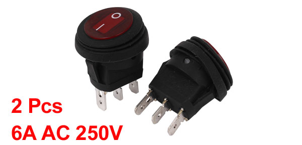 Details2 Pcs 6A AC 250V Red Light On/Off Waterproof SPST Latching Round Rocker Switch  Main Color Black, Red Brand DMiotech Country of Manufacture CHINA Action Type Latching Material Plastic, Metal Mount Size 19.5 x 24mm/0.8" x 0.94"(D*H) Poles SPST Product Name Rocker Switch Net Weight 13g Package Content 2 x Rocker Switch Voltage 6A AC250V LED Light Red Size 22 x 32mm/0.86" x 1.2"(D*H)