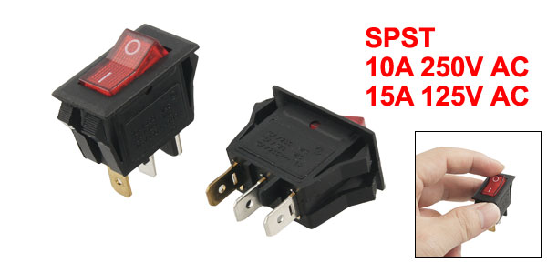Product Name Rocker Switch Poles SPST Terminals 3 Pin (On - Off) Rating Voltage 10A 250V AC, 15A 125V AC Total Size(Each One) 31 x 17 x 37mm / 1.2" x 0.67" x 1.47"(L * W * T) Mount Hole Size 30 x 13mm / 1.18" x 0.5"(L*W) Light Color Red Color Black, Red Material Plastic, Metal Total Weight 17g Package Content 2 x Rocker Switch - Reviews