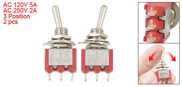 Details2 Pcs AC 120V/5A 250V/2A ON/OFF/ON SPDT Toggle Switches Xgapw  Product Name Toggle Switch Rating AC 120V 5A; AC 250V 2A Pin Number 3 Pins Position 3 Type SPDT Screw Diameter 6mm Total Size(Approx.) 3.3 x 1.3 x 0.7cm / 1.3" x 0.5" x 0.3"(L*W*T) Material Plastic & Metal Color Red & Silver Tone Weight 10g Package Content 2 Pcs x Toggle Switch