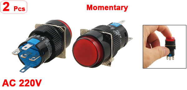 2 Pcs AC 220V Red Light Momentary SPDT Round AC 250V 5A Push Button Switch