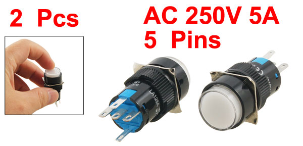 Product Name Push Button Switch Action Type Self Locking Contact Type 1 NO, 1NC (SPDT) Switch Voltage Current AC 250V 5A Ith AC 220V 5A Light Voltage AC 220V Terminals Quanlity 5 Pins Mounting Hole Diameter 16mm / 0.63" Button Diameter 15.5mm / 0.6" Overall Size 18.5 x 18.5 x 40mm / 0.73" x 0.73" x 1.57"(L*W*H) Material Plastic & Metal Light Color White Color White & Black Weight 13g Package Content 2 x Push Button Switch - Reviews