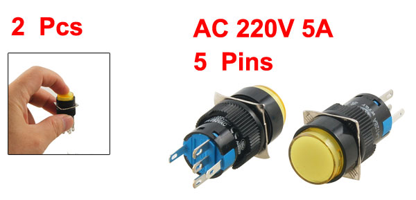 2 Pcs AC 220V Yellow Light Momentary SPDT AC 250V 5A Push Button Switch