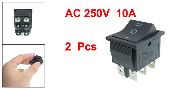 Product Name Rocker Switch Poles DPDT Terminals 6 Pin (On - Off-On) Rating Voltage 10A 250V AC, 20A 125V AC Total Size(Each One) 3 x 2.5 x 2.7cm / 1.2" x 1" x 1.1"(L * W * T) Mount Hole Size 2.8 x 2.6cm / 1.1" x 1"(L*W) Color Black Material Plastic & Metal Total Weight 23g Package Content 2 x Rocker Switch - Reviews