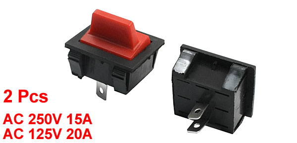 Product Name Rocker Switch Type SPST Terminals 2 Pin Rating Voltage AC 250V 15A, AC 125V 20A Rocker Size 23 x 12mm/1" x 0.43"(L*W) Total Size(Each) 35 x 31 x 43mm/1.3" x 1.2" x 1.7" (L*W*H) Mount Hole Size 29 x 27mm /1.1" x 1.1"(L*W) Color Black, Red Material Plastic & Metal Total Weight 22g