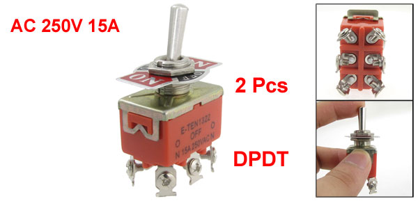 Product Name Toggle Switch Rated Voltage & Current AC 250V, 15A Position 3 Positions(ON/OFF/ON) Type DPDT Mounting Hole Diameter 11.8mm / 0.46" Body Size(Approx.) 33 x 20 x 21mm / 1.3" x 0.8" x 0.83"(L*W*T) Total Height 57mm / 2.2" Material Metal, Resin Weight 58g Package Content 2 Pcs x Toggle Switch - Reviews