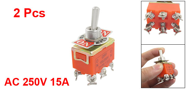 Details2 Pcs AC 250V 15A 3 Position 6 Screw Terminals DPDT Latching Toggle Switch  Product Name Toggle Switch Rating AC 250V 15A Pin Quantity 6 Pin Position 3 Position(On/Off/On) Contact Type DPDT(Latching) Mounting Screw Dia 12mm/ 0.47" Total Size(Approx.) 5.5 x 3 x 1.8cm / 2.2" x 1.2" x 0.7"(L*W*T) Material Plastic, Metal Main Color Orange Weight 61g Package Content 2 x Toggle Switch