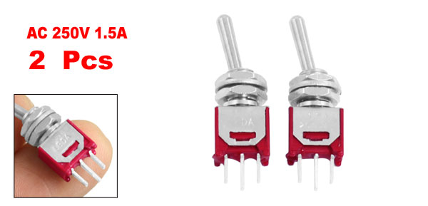 Details2 Pcs AC 250V 1.5A SPDT On/On 2 Position Mini Toggle Switch  Product Name Toggle Switch Material Metal & Plastic Type SPDT (ON/ON) Thead Dia(Approx) 0.47cm / 0.185" Pitch 2mm Body Size 8 x 5 x 8mm (L*W*H) Power AC250V, 1.5A Total Height 2.8cm / 1.1" Color Red & Silver Tone Weight 7g Package Content 2 Pcs x Toggle Switch