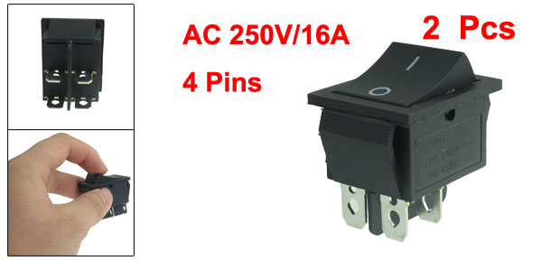 Product Name Rocker Switch Poles DPST Terminals 4 Pin (On - Off) Rating Voltage 16A 250V AC, 20A 125V AC Total Size(Each One) 3.2 x 2.5 x 3.5cm / 1.3" x 1" x 1.4"(L * W * T) Mount Hole Size 30.8 x 21.4mm / 1.21" x 0.84"(L*W) Color Black Material Plastic & Metal Total Weight 24g Package Content 2 x Rocker Switch - Reviews