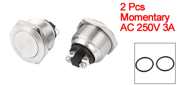Item Name Push Button Switch Action Type Momentary Type Head Shape Flat Head Contact SPST(1NO) Switch Rating AC 250V 3A Terminals Number 2 Panel Cutout Diameter 22mm/0.87" Total Size 26 x 25mm/ 1" x 1" (L*Max.W) Material Metal, Plastic, Electric Parts Housing Color Silver Tone Weight 60g Package Content 2 x Push Button Switch - Reviews