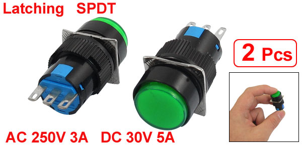 2 Pcs AC 250V 3A DC 30V 5A 3 Pin NO/NC Green Round Latching Push Button Switch