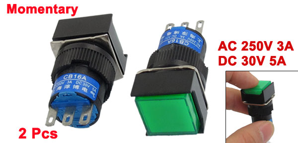 2 Pcs AC 250V 3A DC 30V 5A NO NC Green Sign Square Momentary Push Button Switch