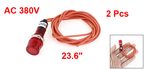 Details2 PCS AC 380V 23.6" Long Cable Red Light Water Heater Indicator Lamp  Product Name Indicator Light Working Voltage AC 380V Light Source Neon Lamp Light Color Red Cable Length 60cm / 23.6" Overall Size 63.5 x 1.3cm / 25" x 0.5"(L*Max.D) Weight 20g Package Content 2 x Indicator Light