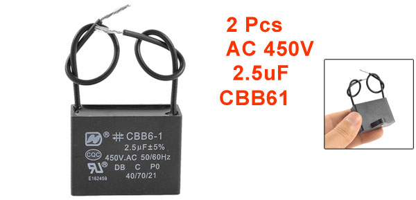 Product Name Motor Capacitor Model CBB61 Color Black External Material Plastic Dielectric Material Metalized Polypropylene Film Rated Capacitance 2.5uF Tolerance +/-5% Rated Frequency 50/60Hz Rated Voltage AC 450V Body Size 38 x 29 x 16mm/ 1.5" x 1.1" x 0.7"(L*T*W) Fixing Hole Diameter 4mm/0.15" Cable Length 10cm/ 3.9" Net Weight 44g Package Content 2 x Motor Run Capacitor - Reviews