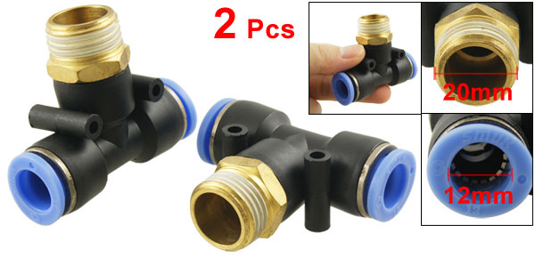 Product Name Pneumatic Quick Fittings Type T Connector One Touch Connector 12mm/ 0.47" Male Thread OD 20mm/ 0.79" Thread Size 1/2" Material Plastic, Metal Dimension (Approx) 5.8 x 5 x 2.1cm/ 2.28" x 2" x 0.83" (L*W*T) Color Black, Blue Weight 95g Package Content 2 x Pneumatic Quick Fittings - Reviews