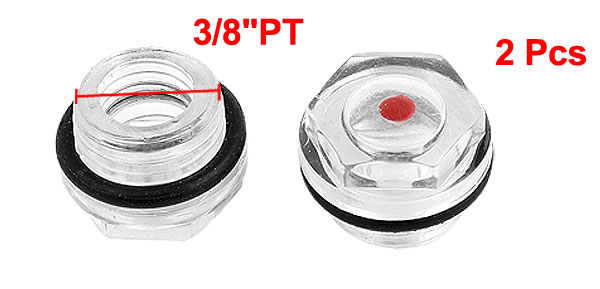 Product Name Oil Level Sight Glass Material Plastic Color Clear, Black Thread Diameter 15.7mm/ 0.6" Thread Size PT 3/8" Overall Size 20 x 15.6mm/ 0.8" x 0.6" (Max.D*T) Net Weight 7g Package Content 2 x Oil Level Sight Glass - Reviews
