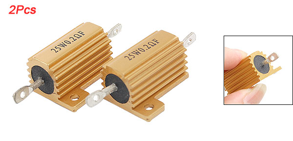 Product Name Aluminum Housed Wirewound Resistor Resistance Value 0.2 Ohm Power Rating 25W Resistance Tolerance ± 1% (F) Body Size 2.7 x 1.5cm / 1.1" x 0.6" (L*D) Total Size 5.2 x 2.8 x 1.5cm / 2" x 1.1" x 0.6" (L*W*H) Casing Material Aluminum Color Gold Tone Weight 29g Package Content 2 x Aluminum Housed Wirewound Resistors - Reviews