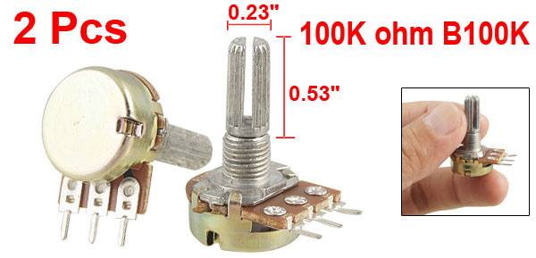 Product Name Potentiometer Resistance Value 100K ohm Power 1/2W Adjustment Type Top Adjustment Type Single Linear (Type B) Features Knurled Shaft Shaft Diameter 6mm / 0.23" Shaft Length 13.5mm / 0.53" Mounting Hole 6.9mm / 0.27" Base Height 7.1mm / 0.28" Base Diameter 16mm / 0.62" Material Metal w Electronic Parts Color As Picture Show Weight 13g Package 2 x Potentiometers - Reviews