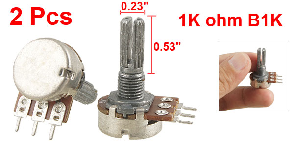 Product Name Potentiometer Resistance Value 1K ohm Power 1/2W Adjustment Type Top Adjustment Type Single Linear (Type B) Features Knurled Shaft Shaft Diameter 6mm / 0.23" Shaft Length 13.5mm / 0.53" Mounting Hole 6.9mm / 0.27" Base Height 7.1mm / 0.28" Base Diameter 16mm / 0.62" Material Metal w Electronic Parts Color As Picture Show Weight 13g Package 2 x Potentiometers - Reviews