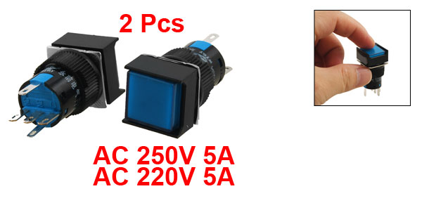 Product Name Push Button Switch Action Type Self Locking Contact Type 1 NO, 1NC (SPDT) Switch Voltage Current AC 250V 5A Ith AC 220V 5A Light Voltage DC 12V Terminals Quanlity 5 Pins Mounting Hole Diameter 15.7mm / 0.618" Button Size 15 x 15mm / 0.6" x 0.6"(L*W) Overall Size 17.5 x 17.5 x 39mm / 0.7" x 0.7" x 1.5"(L*W*H) Material Plastic & Metal Light Color Blue Color Blue & Black Weight 15g Package Content 2 x Push Button Switch - Reviews