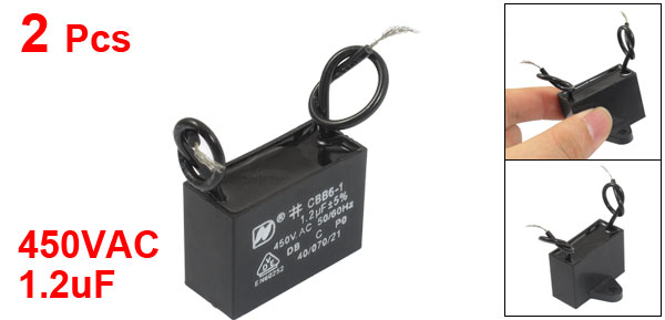 Product Name Capacitor Model CBB6-1 Dielectric Material Metallized Polypropylene External Material Plastic Rated Capacitance 1.2uF Tolerance +/-5% Rated Frequency 50/60Hz Rated Working Voltage 450VAC Mounting Hole Diameter 4.5mm / 0.17" Boby Size 3.7 x 1.6 x 2.6cm / 1.5" x 0.64" x 1" (L*W*H) Wire Length(Each) 9cm / 3.5" Main Color Black Weight 36g Package Content 2 Pcs x Capacitor - Reviews