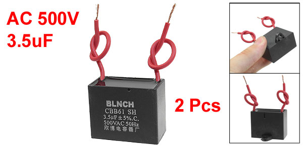 Product Name Motor Capacitor Model CBB61 External Material Plastic Dielectric Material Metalized Polypropylene Film Rated Capacitance 3.5uF Tolerance +/-5% Rated Frequency 50Hz Rated Voltage AC 500V Body Size 3.8 x 2 x 3cm/ 1.5" x 0.8" x 1.2"(L*W*T) Mount Hole Diameter 4mm/0.16" Cable Length 8cm/ 2.8" Net Weight 59g Package Content 2 x Motor Run Capacitor - Reviews