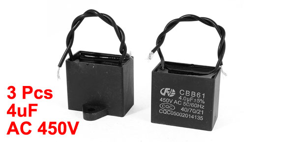 Product Name Motor Capacitor Model CBB61 External Material Plastic Dielectric Material Metalized Polypropylene Film Rated Capacitance 4uF Tolerance ±5% Rated Frequency 50/60Hz Rated Voltage AC 450V Body Size 40 x 23 x 34mm/ 1.6" x 0.9" x 1.3"(L*W*T) Fixing Hole Diameter 5mm/0.2" Cable Length 10cm/ 3.9" Net Weight 100g Package Content 3 x Motor Run Capacitor - Reviews