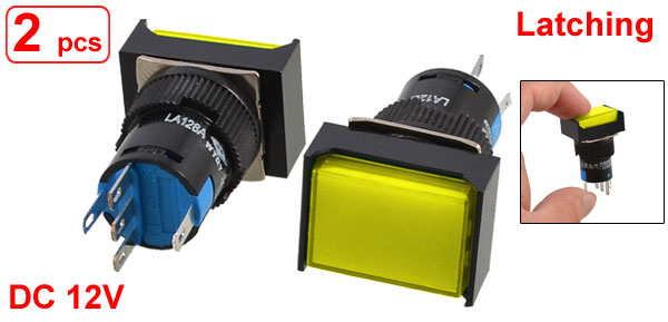2 Pcs DC 12V Yellow Lamp Light Latching Rectangular 16mm Push Button Switch
